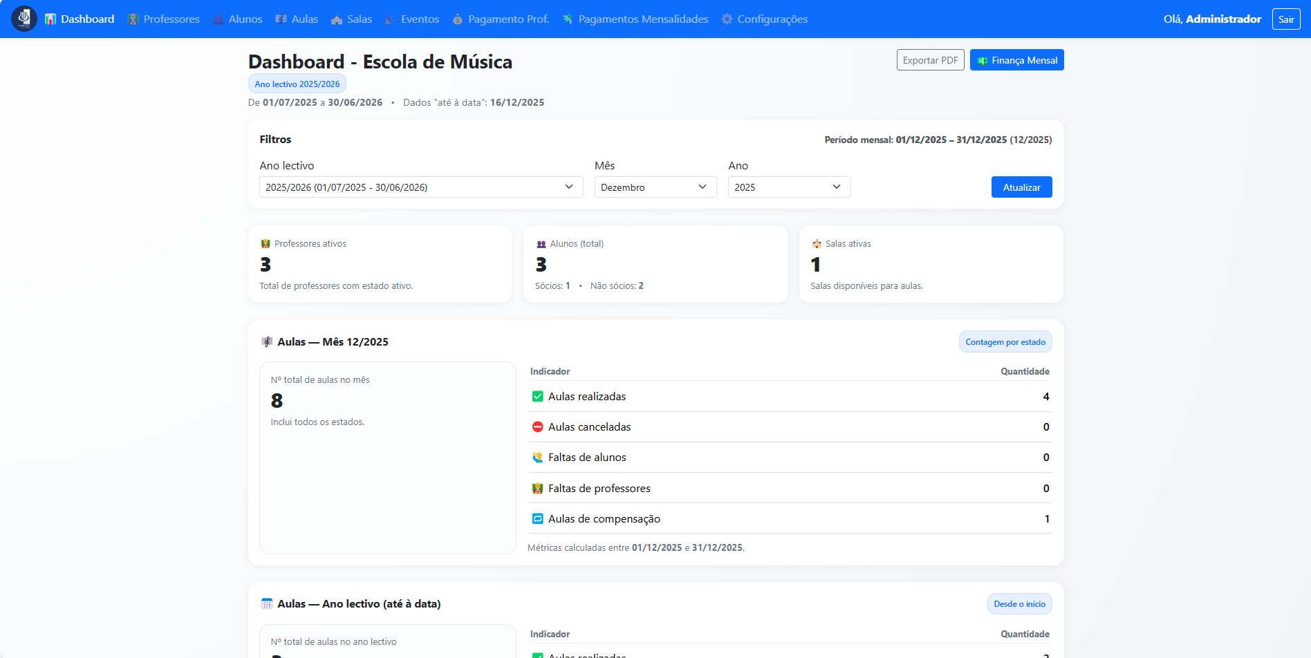 Gestão de professores, alunos, aulas e presenças (com relatórios mensais).