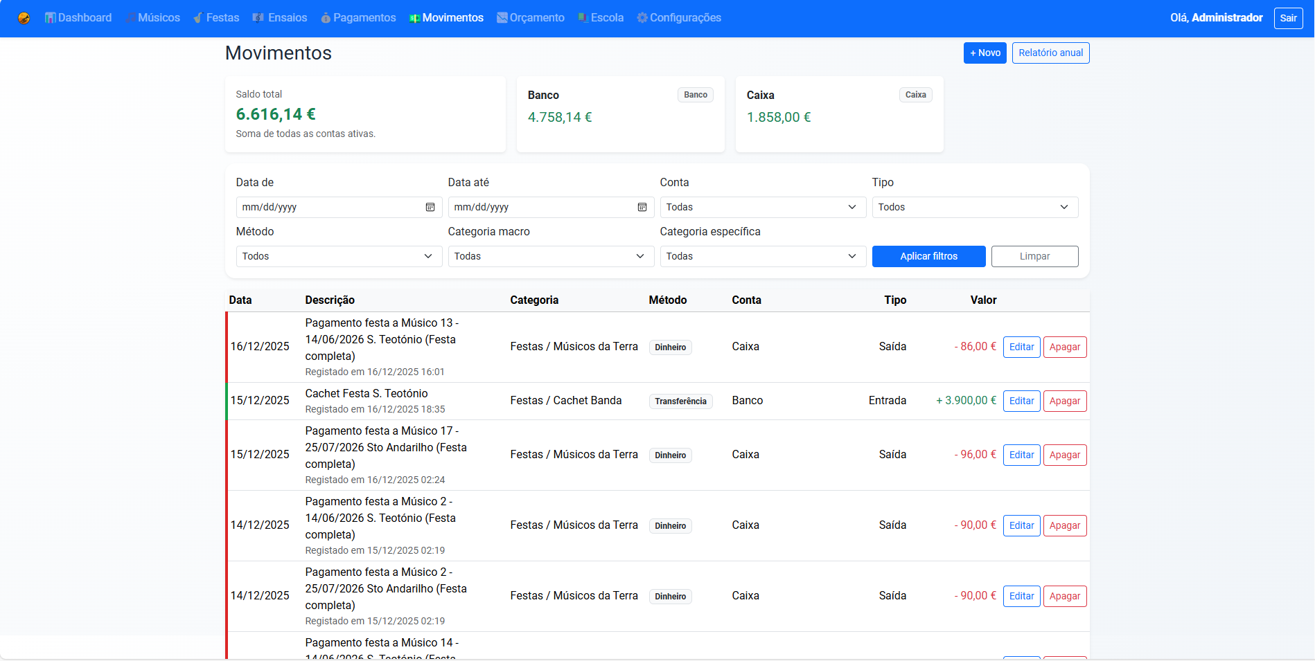 Histórico anual com festas, ensaios e valores recebidos, pronto num clique.
